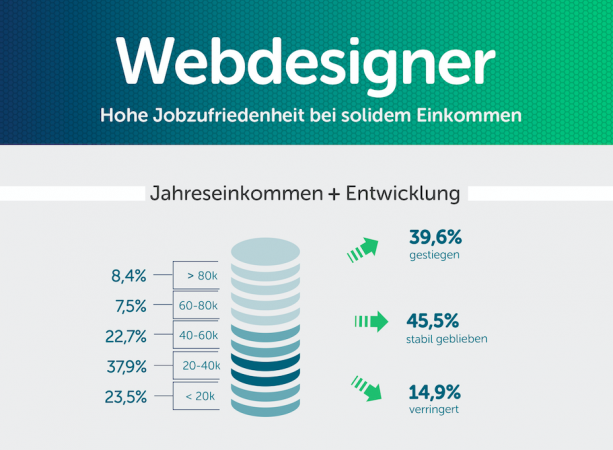 Die Arbeit als Webdesigner verschafft im Schnitt ein solides Einkommen: Die mit 37,9 Prozent größte Gruppe hat ein Jahreseinkommen von 20.000-40.000 Euro. Ein knappes Viertel kommt auf 40.000-60.000 Euro im Jahr. 15,9 Prozent verdienen mehr als 60.000 Euro, ein Viertel der befragten Webdesigner weniger als 20.000 Euro im Jahr. Die Höhe der Einkommen ist stabil. Bei 45,5 Prozent blieben sie unverändert, bei 39,6 Prozent sind sie gestiegen und nur bei 14,9 Prozent gesunken.